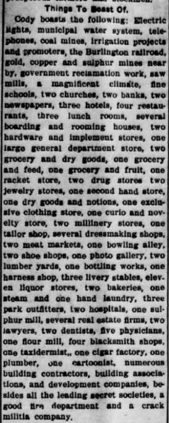 The first reference to match game competitions in Cody was at the (Fred & Jim) Worst Brothers Bowling Alley October 17, 1906. Previous businesses at this location include the Cody Sporting Goods store in 1950s. |