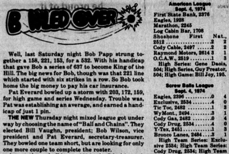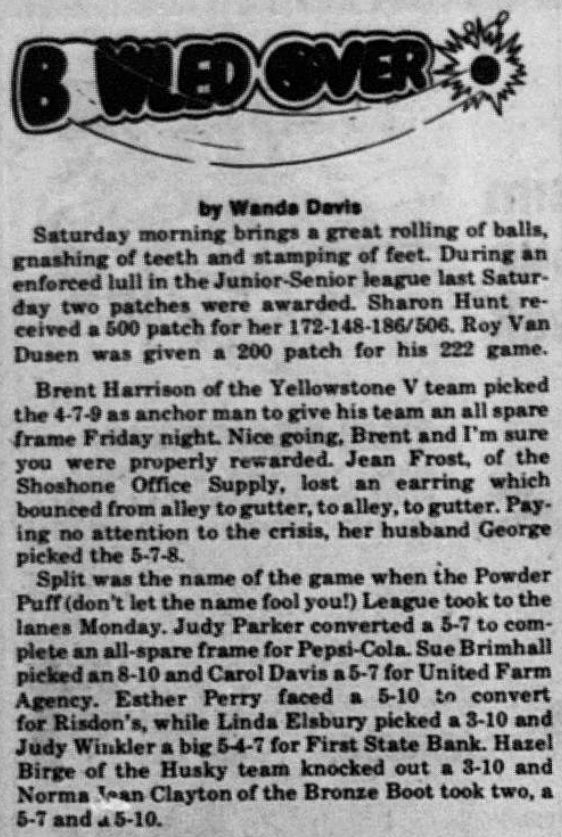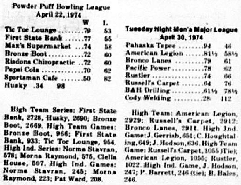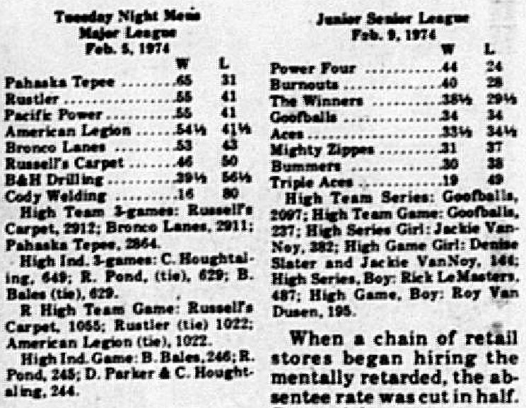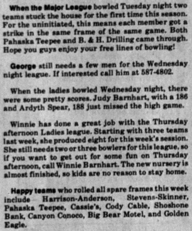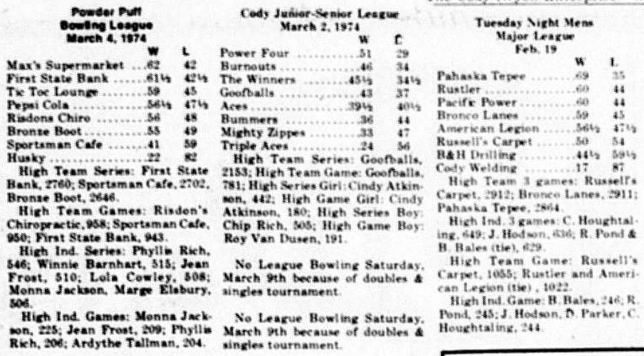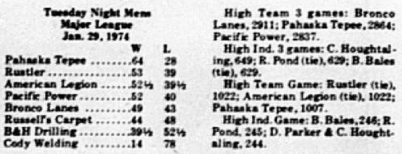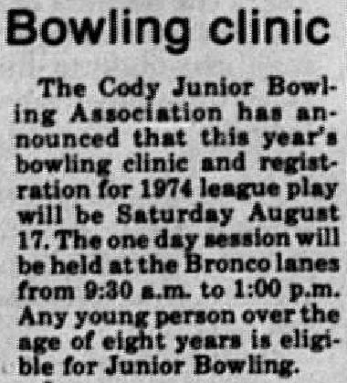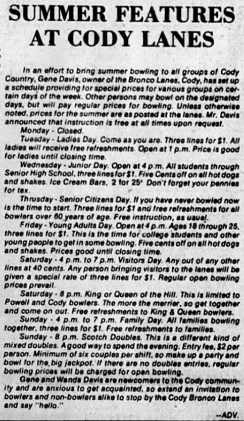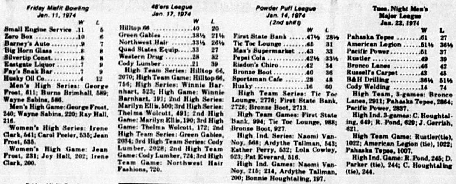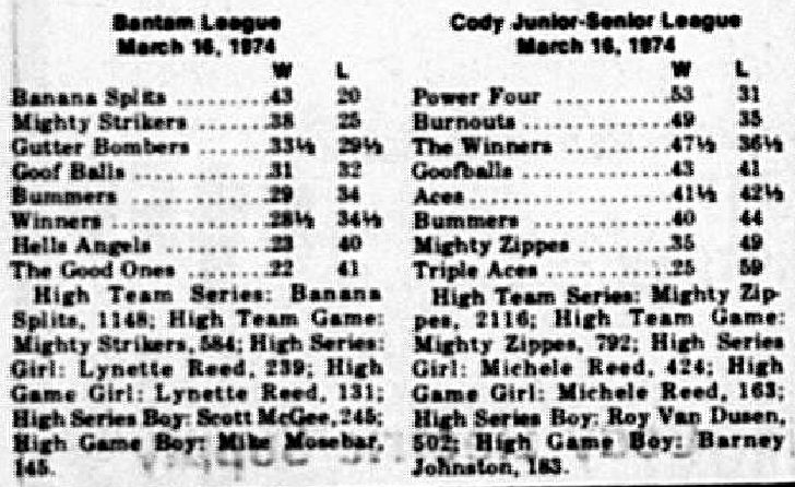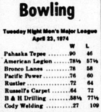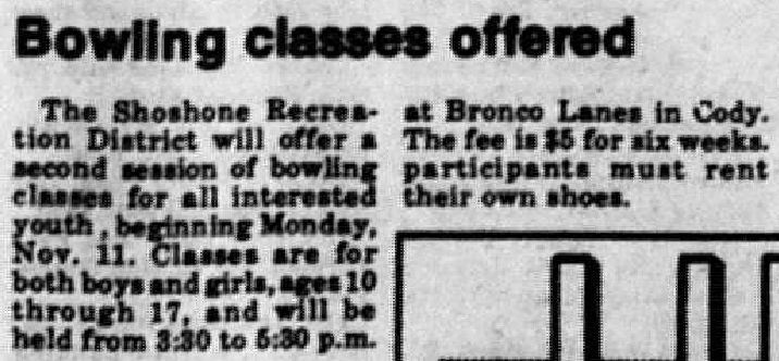 Wally Heine of Worland proposed the new bowling alley and Harold Casey was the first manager which had its grand opening Aug 26-29, 1971.