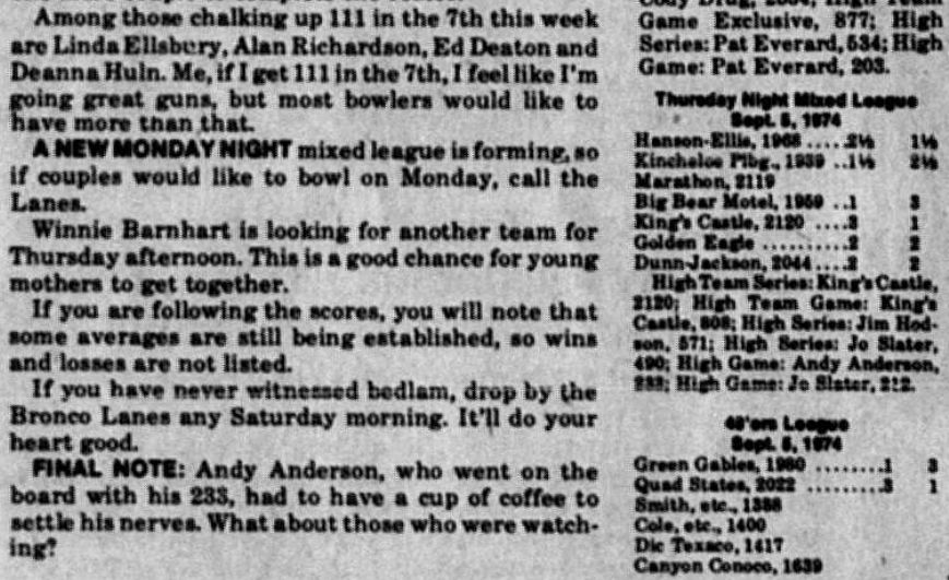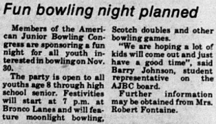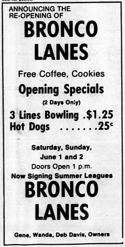 The 8 lanes installed in 1971 came from Torrington (per Kirk Morgan), establishing Bronco Lanes' 2nd location (1st location was already established in Worland).