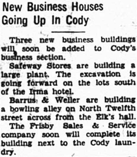 Construction started on the building in July 1947 (per 07-16-1947 Cody Enterprise) and completed in Dec 1947 (per 12-10-1947 Cody Enterprise) at an estimated cost of $9,000.
