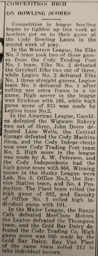 In 1948, the address was 948 12th St. but was corrected to 922 12th St. due to a poor city address numbering system. Everett Weller (owner/manager) sold the lanes to the Mountain States Motor Company (Ford Motor Co.) and it operated under Cody Motors which had a grand opening March 31st, 1951. Everett Weller was a bowling alley owner out of Riverton (not sure which alleys). |